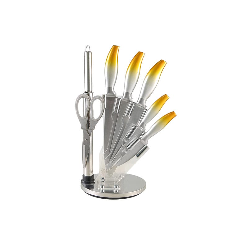 8”chef knife, 8” bread knife, 8”slicing knife, 5”utility knife, 3.5”paring knife, sharpener, scissor, acrylic stand